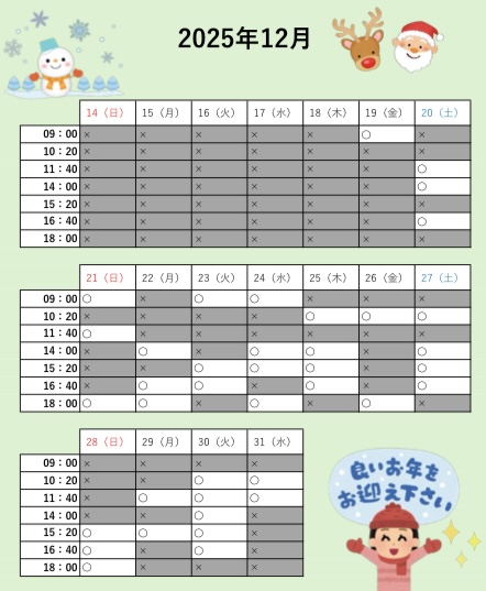 年末は2025年12月31日(水)14時のご予約が最終になります。