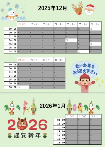 年始は2026年1月4日(日)14時のご予約から始業になります。