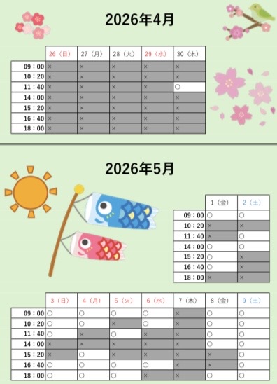 当院のGWの予定についてです。4月29日(水)から5月6日(水)までの日曜日、祝日ともに営業しております。今のところ空いている時間もありますので、お休みの合間にお越しいただければと思います。
